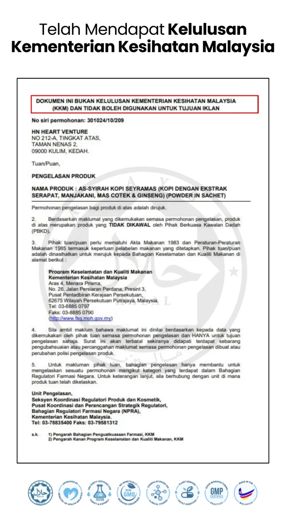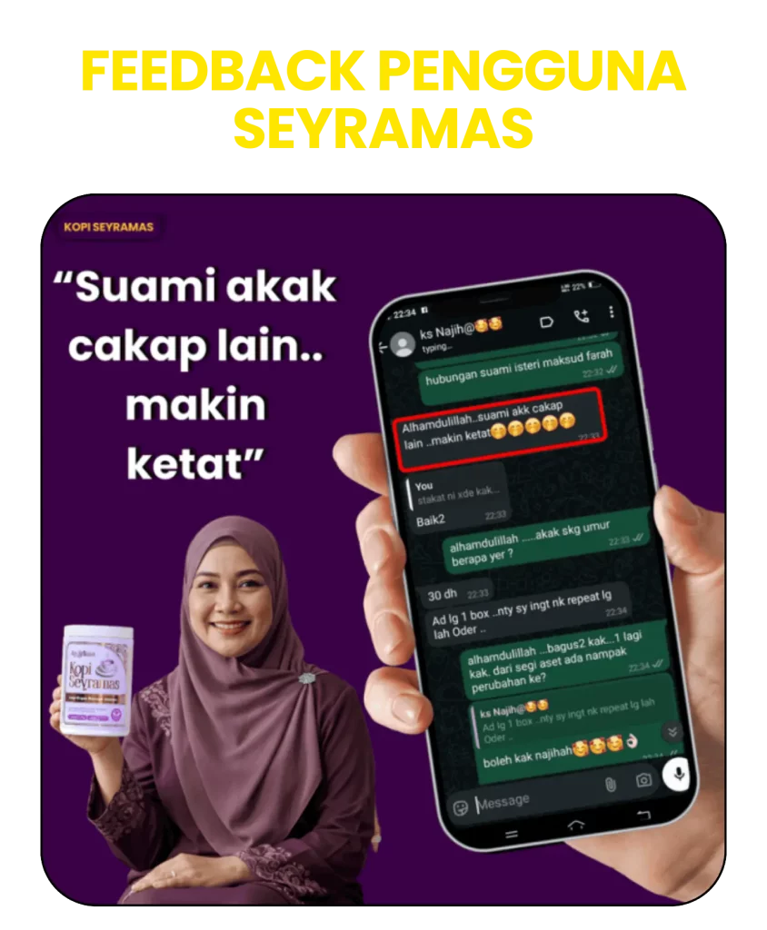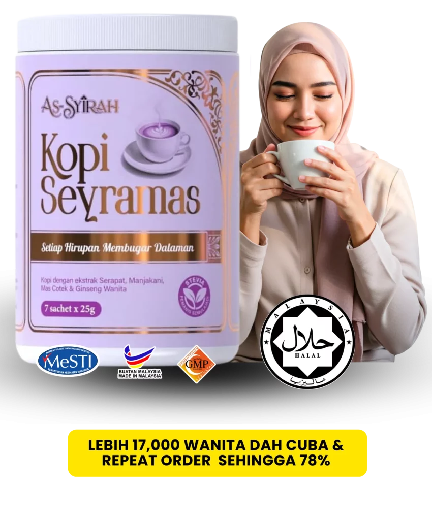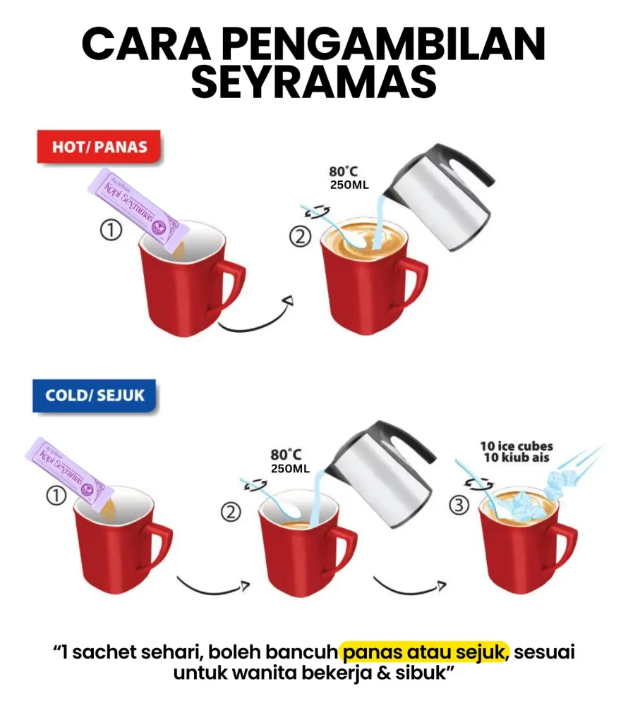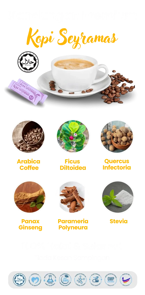 Ini disebabkan teknologi Nano Swiss mRNA Kopi Seyramas dan gabungan formula herba yang lengkap iaitu Mas Cotek, Manjakani, Akar Serapat & Ginseng Wanita.